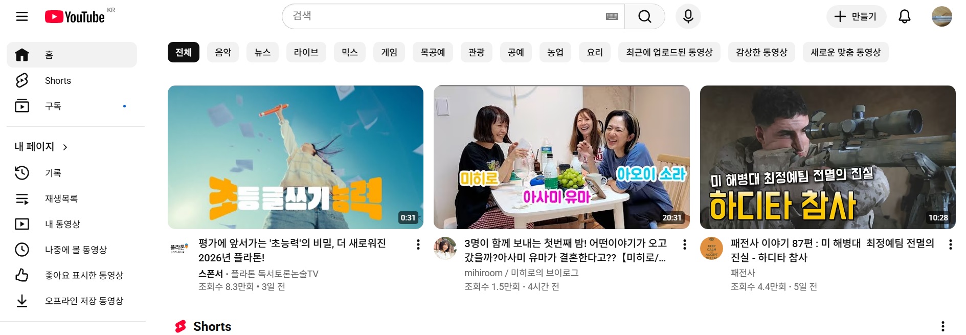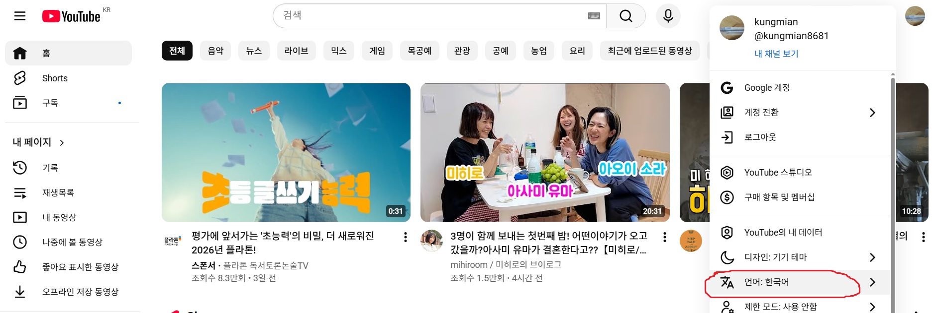 어느날 갑자기 유튜브 로그인하려면 검은커튼같은 화면이 지나간후 로그인된후 한국어 항목들이 안나오는 영어를 한국어로 번역된 이상한 한국어 메뉴들이 나타났다.